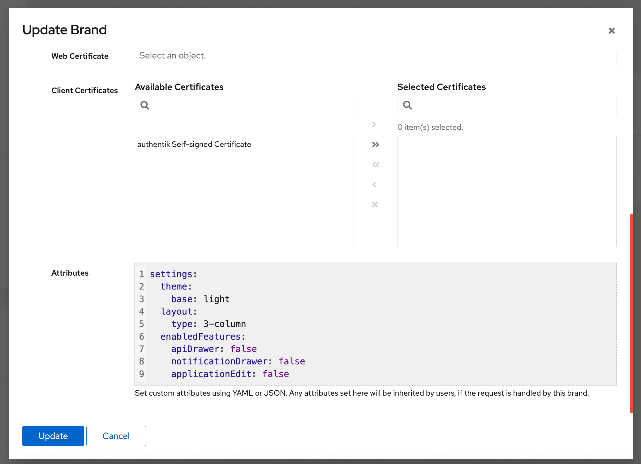The features listed below can be enabled or disabled through attributes set on the Brand. By default, all of the listed features are enabled. To disable a specific feature, set its value to false.